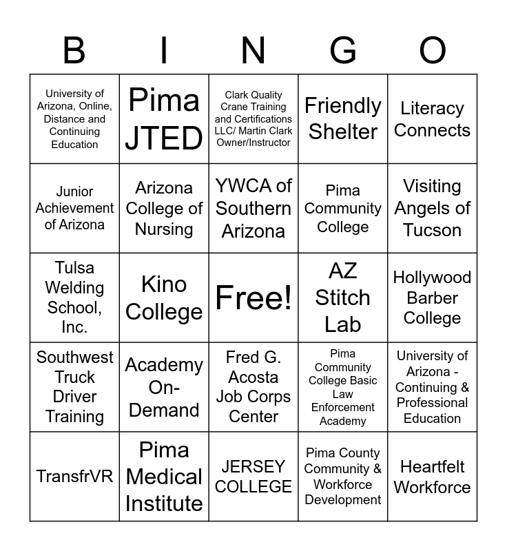 This bingo card has a free space and 24 words: Academy On-Demand, Pima Medical Institute, YWCA of Southern Arizona, TransfrVR, Literacy Connects, University of Arizona, Online, Distance and Continuing Education, Junior Achievement of Arizona, Pima JTED, AZ Stitch Lab, Fred G. Acosta Job Corps Center, Pima Community College, Tulsa Welding School, Inc., Pima Community College Basic Law Enforcement Academy, University of Arizona - Continuing & Professional Education, Arizona College of Nursing, Pima County Community & Workforce Development, Hollywood Barber College, Clark Quality Crane Training and Certifications LLC/ Martin Clark Owner/Instructor, Visiting Angels of Tucson, Kino College, Heartfelt Workforce, Southwest Truck Driver Training, Friendly Shelter and JERSEY COLLEGE.