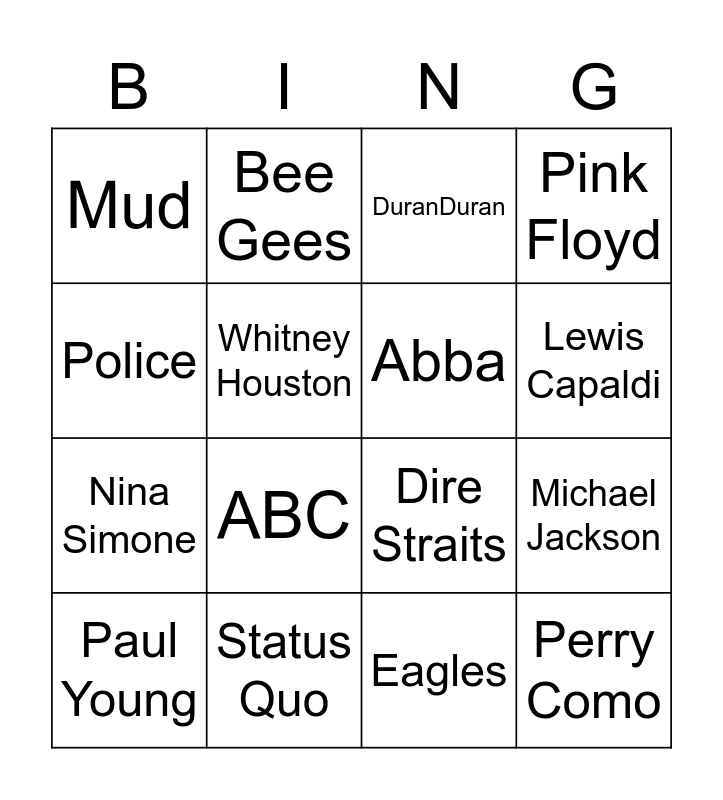 This bingo card has 24 words: Madonna, Bruce Springsteen, Lewis Capaldi, George Ezra, Police, Mud, Whitney Houston, Bee Gees, Status Quo, Barry White, Nina Simone, Dire Straits, Meatloaf, George Michael, Abba, Pink, Eagles, DuranDuran, ABC, Michael Jackson, Paul Young, Perry Como, Pink Floyd and Thin Lizzy.