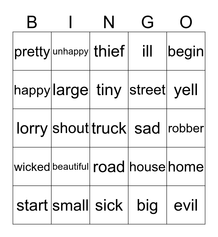 This bingo card has a free space and 24 words: beautiful, small, tiny, start, begin, pretty, happy, unhappy, sad, road, street, lorry, house, home, large, big, robber, thief, yell, shout, evil, wicked, ill and sick.