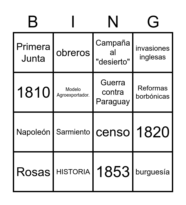 This bingo card has 28 words: Revolución Industrial, Revolución Francesa, Napoleón, Virreinato Rio de la Plata, Modelo Agroexportador., Campaña al "desierto", obreros, burguesía, HISTORIA, Ferrocarril, censo, invasiones inglesas, ilustración, Mitre, Sarmiento, Avellaneda, Roca, Guerra contra Paraguay, Reformas borbónicas, Revolución de Mayo, Primera Junta, Caudillismo, Rosas, 1820, 1853, 1880, 1810 and 1816.
