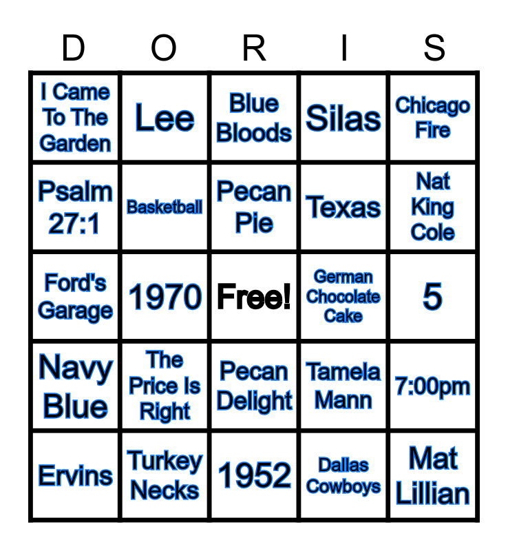 This bingo card has a free space and 24 words: The Price Is Right, Turkey Necks, Pecan Pie, Ervins, Chicago Fire, I Came To The Garden, Psalm 27:1, Lee, German Chocolate Cake, Pecan Delight, Texas, Ford's Garage, Tamela Mann, 7:00pm, Basketball, Dallas Cowboys, 5, Blue Bloods, Nat King Cole, 1970, Mat Lillian, Navy Blue, Silas and 1952.