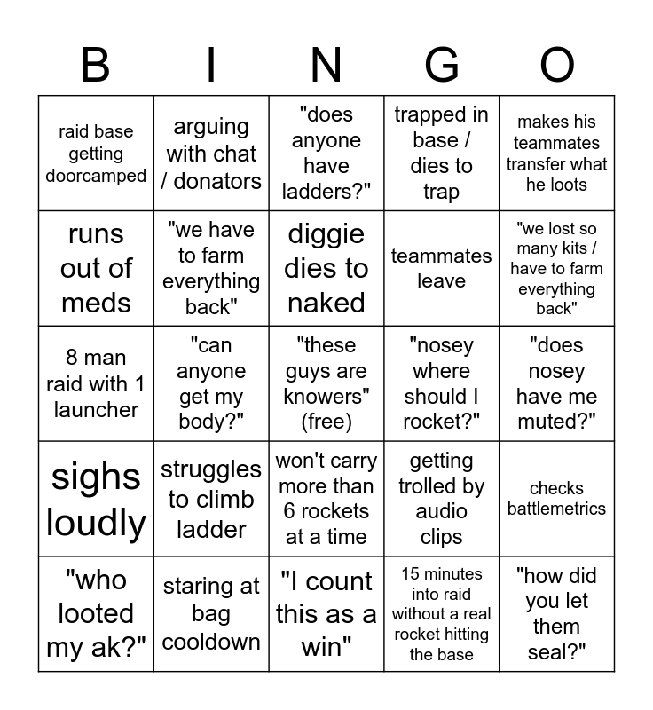 This bingo card has a free space and 27 words: getting trolled by audio clips, comms killing nakeds, teammates leave, "I count this as a win", runs out of meds, "does anyone have ladders?", arguing with chat / donators, sighs loudly, "nosey where should I rocket?", checks battlemetrics, 8 man raid with 1 launcher, trapped in base / dies to trap, "who looted my ak?", staring at bag cooldown, "we lost so many kits / have to farm everything back", gambles / on phone / afk during raid, "we have to farm everything back", diggie dies to naked, struggles to climb ladder, raid base getting doorcamped, "does nosey have me muted?", 15 minutes into raid without a real rocket hitting the base, "can anyone get my body?", "how did you let them seal?", won't carry more than 6 rockets at a time, makes his teammates transfer what he loots and runs one kit back to raid base.