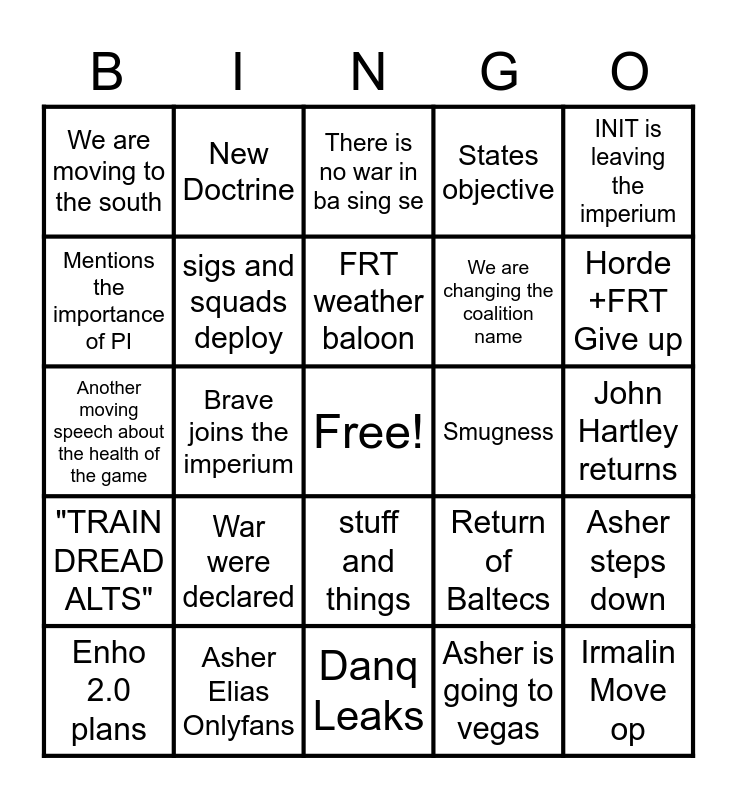 This bingo card has a free space and 24 words: War were declared, Asher Elias Onlyfans, FRT weather baloon, Enho 2.0 plans, INIT is leaving the imperium, We are moving to the south, Mentions the importance of PI, New Doctrine, Smugness, stuff and things, We are changing the coalition name, Another moving speech about the health of the game, Return of Baltecs, Asher steps down, sigs and squads deploy, Asher is going to vegas, John Hartley returns, There is no war in ba sing se, Horde +FRT Give up, Brave joins the imperium, Irmalin Move op, "TRAIN DREAD ALTS", States objective and Danq Leaks.
