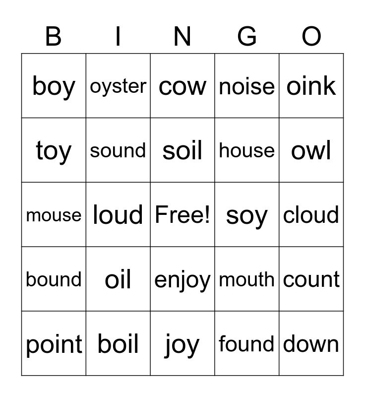 This bingo card has a free space and 24 words: oil, boil, soil, point, oink, boy, toy, oyster, soy, enjoy, house, mouse, mouth, count, sound, found, cloud, cow, owl, loud, down, bound, noise and joy.