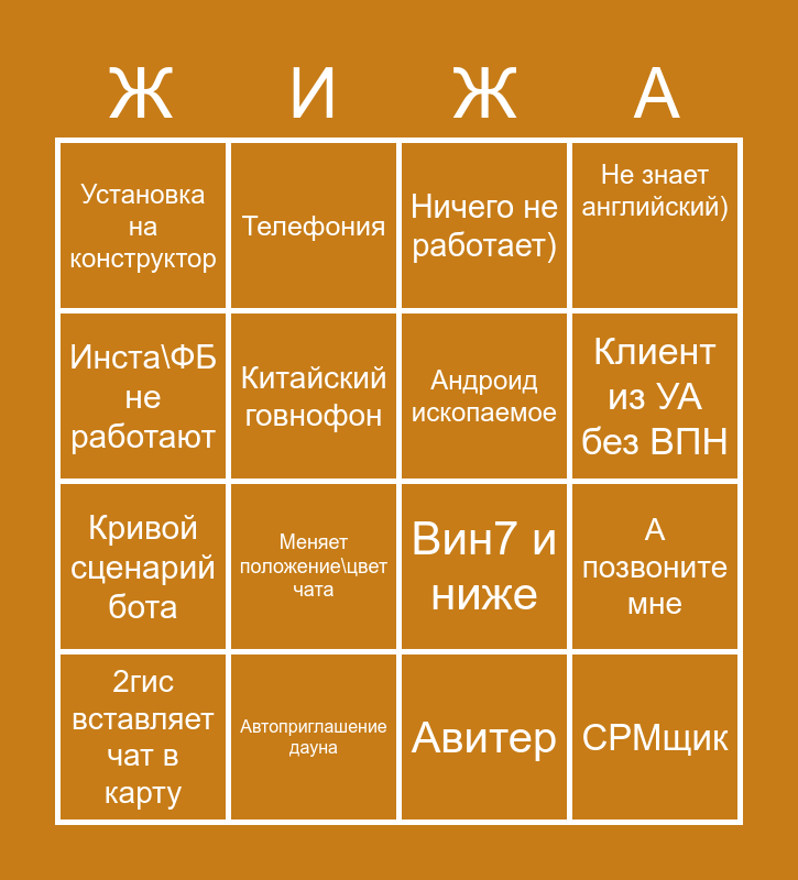 This bingo card has 16 words: Автоприглашение дауна, А позвоните мне, Ничего не работает), Установка на конструктор, Кривой сценарий бота, Телефония, Вин7 и ниже, Авитер, Инста\ФБ не работают, Китайский говнофон, 2гис вставляет чат в карту, Не знает английский), Меняет положение\цвет чата, Клиент из УА без ВПН, Андроид ископаемое and СРМщик.