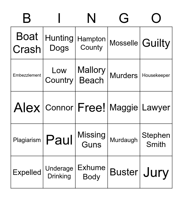 This bingo card has a free space and 24 words: Paul, Underage Drinking, Mallory Beach, Expelled, Guilty, Boat Crash, Embezzlement, Hunting Dogs, Maggie, Missing Guns, Murders, Alex, Murdaugh, Stephen Smith, Low Country, Buster, Lawyer, Hampton County, Housekeeper, Connor, Jury, Plagiarism, Mosselle and Exhume Body.