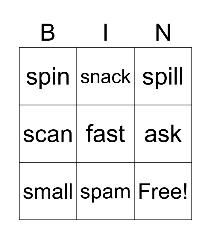 This bingo card has 16 words: Stan, small, spill, spin, Free!, snack, must, last, fast, ask, dust, scan, Stan, spam, small and spin.