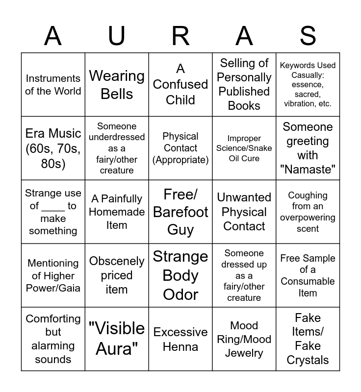 This bingo card has a free space and 24 words: Obscenely priced item, "Visible Aura", Physical Contact (Appropriate), Comforting but alarming sounds, Keywords Used Casually: essence, sacred, vibration, etc., Instruments of the World, Era Music (60s, 70s, 80s), Wearing Bells, Unwanted Physical Contact, Strange Body Odor, Improper Science/Snake Oil Cure, Strange use of ____ to make something, Someone dressed up as a fairy/other creature, Free Sample of a Consumable Item, Someone underdressed as a fairy/other creature, Mood Ring/Mood Jewelry, Coughing from an overpowering scent, A Confused Child, Someone greeting with "Namaste", A Painfully Homemade Item, Fake Items/ Fake Crystals, Mentioning of Higher Power/Gaia, Selling of Personally Published Books and Excessive Henna.