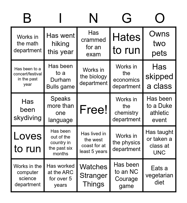 This bingo card has a free space and 24 words: Has been out of the country in the past six months, Has worked at the ARC for over 5 years, Works in the biology department, Works in the computer science department, Owns two pets, Works in the math department, Has been to a concert/festival in the past year, Has went hiking this year, Works in the chemistry department, Has lived in the west coast for at least 5 years, Works in the economics department, Has been skydiving, Works in the physics department, Has taught or taken a class at UNC, Has been to a Durham Bulls game, Has been to an NC Courage game, Has been to a Duke athletic event, Has crammed for an exam, Has skipped a class, Speaks more than one language, Eats a vegetarian diet, Loves to run, Hates to run and Watches Stranger Things.