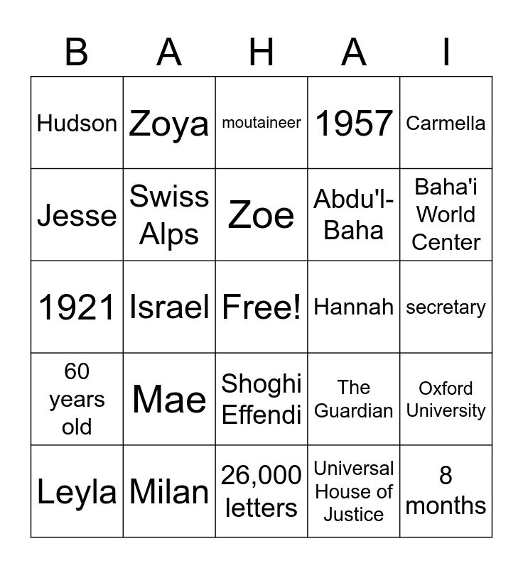 This bingo card has a free space and 24 words: Mae, Milan, Zoe, Leyla, Carmella, Hudson, Jesse, Zoya, Hannah, Shoghi Effendi, Abdu'l-Baha, 1921, The Guardian, Oxford University, Swiss Alps, Universal House of Justice, secretary, moutaineer, Baha'i World Center, Israel, 8 months, 60 years old, 1957 and 26,000 letters.