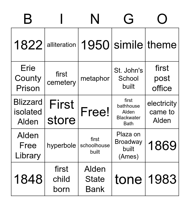 This bingo card has a free space and 24 words: hyperbole, first child born, metaphor, 1848, theme, 1822, Erie County Prison, alliteration, first bathhouse Alden Blackwater Bath, first schoolhouse built, St. John's School built, Blizzard isolated Alden, Plaza on Broadway built (Ames), 1869, first cemetery, tone, electricity came to Alden, 1950, first post office, First store, 1983, Alden Free Library, simile and Alden State Bank.