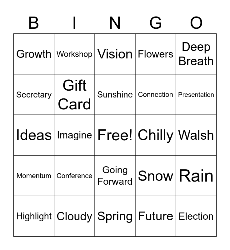 This bingo card has a free space and 49 words: EOCA, Election, Counseling, Spring, Conference, Supervision, Workshop, President Elect, Secretary, Self-Care, Gift Card, Flowers, Rain, Snow, OCA, Email, Sunshine, Chilly, Mindful, Deep Breath, Imagine, Future, Growth, Connection, Community, Presentation, Highlight, Strengths, Going Forward, Momentum, Movement, Leader, Zoom, Online, Cloudy, Malone, YSU, Kent, Walsh, Franciscan, Virtual, Break Out, Team, Collaborate, Ideas, Vision, Share, Empower and Encourage.