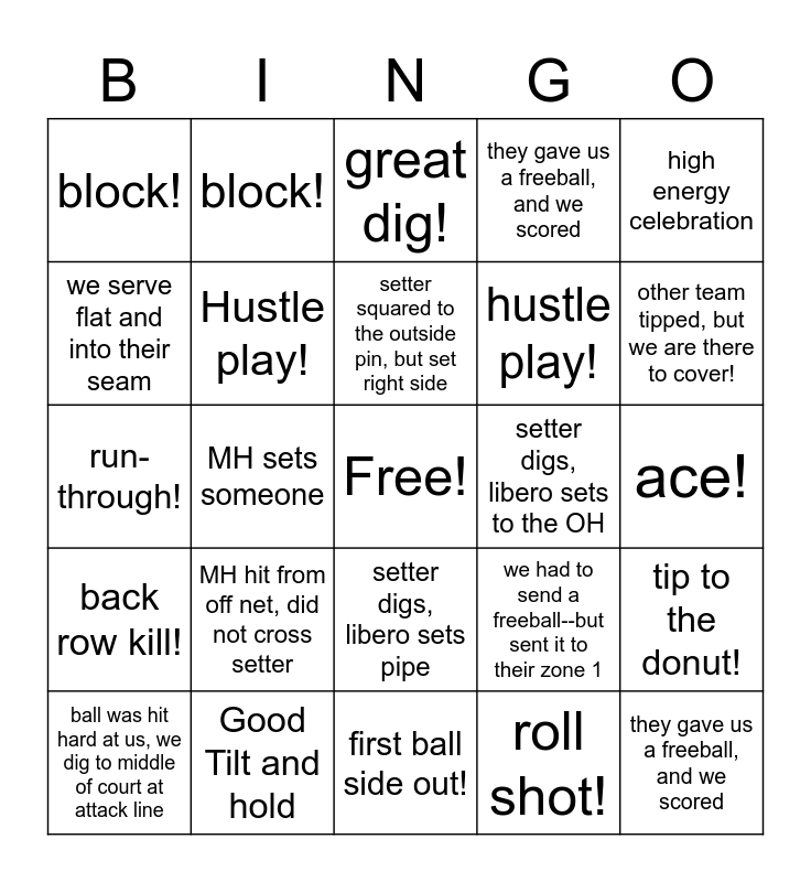 This bingo card has a free space and 24 words: MH hit from off net, did not cross setter, Good Tilt and hold, setter squared to the outside pin, but set right side, ball was hit hard at us, we dig to middle of court at attack line, high energy celebration, block!, we serve flat and into their seam, block!, setter digs, libero sets to the OH, setter digs, libero sets pipe, hustle play!, run-through!, we had to send a freeball--but sent it to their zone 1, tip to the donut!, Hustle play!, roll shot!, ace!, great dig!, other team tipped, but we are there to cover!, MH sets someone, they gave us a freeball, and we scored, back row kill!, they gave us a freeball, and we scored and first ball side out!.