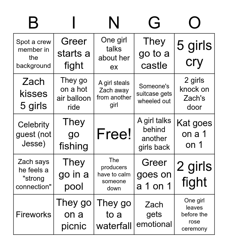 This bingo card has a free space and 24 words: They go in a pool, They go on a picnic, A girl steals Zach away from another girl, Fireworks, 5 girls cry, Spot a crew member in the background, Zach kisses 5 girls, Greer starts a fight, A girl talks behind another girls back, The producers have to calm someone down, Someone's suitcase gets wheeled out, Celebrity guest (not Jesse), Greer goes on a 1 on 1, 2 girls fight, They go on a hot air balloon ride, Zach gets emotional, Kat goes on a 1 on 1, One girl talks about her ex, 2 girls knock on Zach's door, They go fishing, One girl leaves before the rose ceremony, Zach says he feels a "strong connection", They go to a castle and They go to a waterfall.