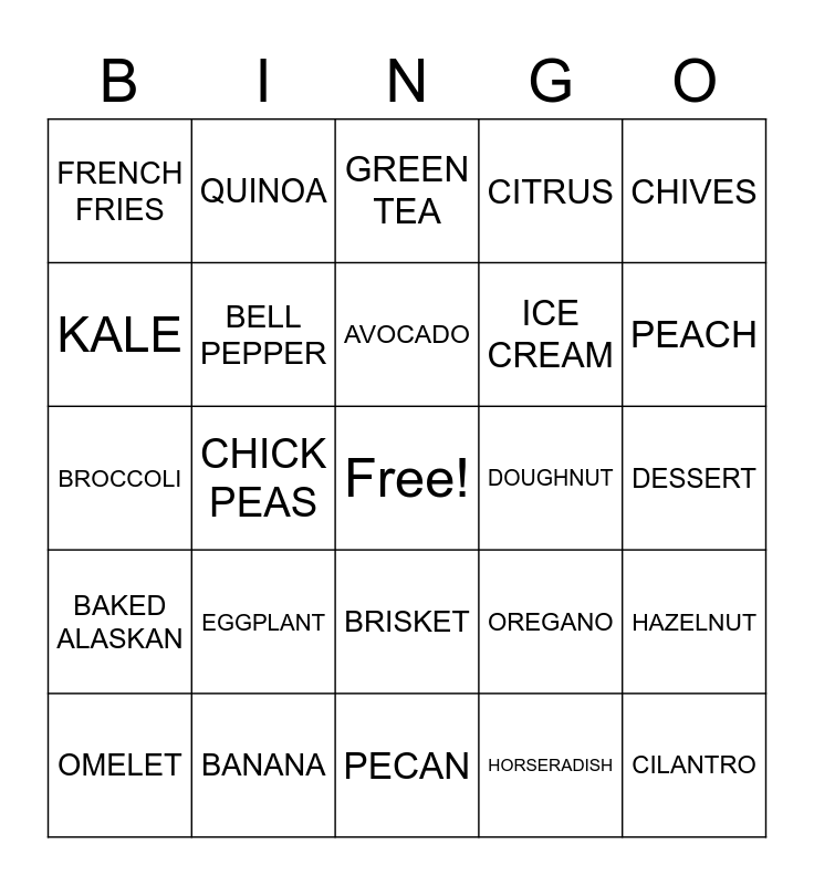 This bingo card has a free space and 40 words: ASPARAGUS, BROCCOLI, BRUNCH, BELL PEPPER, BANANA, BRISKET, AVOCADO, ACORN SQUASH, CHIVES, BAKED ALASKAN, CHICK PEAS, CITRUS, CILANTRO, DESSERT, DOUGHNUT, EGGPLANT, FRRITTER, FRENCH FRIES, FAVA BEANS, GREEN TEA, HAZELNUT, HORSERADISH, ICE CREAM, KALE, KIDNEY BEANS, KUMQUAT, LOBSTER, MACAROON, MOZZARELLA, MUSSELS, NOODLES, OMELET, ONION, OREGANO, PEACH, PECAN, PILAF, POMEGRANATE, QUINOA and RAISIN.