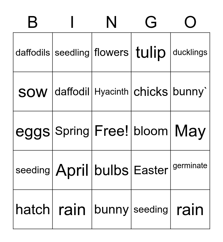 This bingo card has a free space and 24 words: April, rain, Hyacinth, hatch, ducklings, daffodils, sow, seedling, bloom, bulbs, chicks, eggs, Easter, germinate, daffodil, seeding, May, flowers, bunny`, Spring, rain, seeding, tulip and bunny.