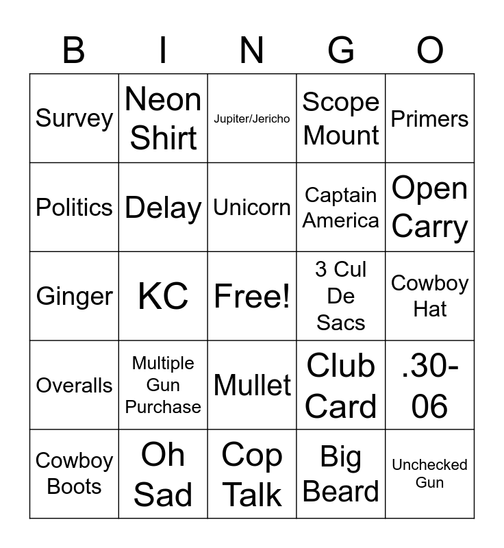 This bingo card has a free space and 24 words: Multiple Gun Purchase, Oh Sad, Unicorn, Cowboy Boots, Primers, Survey, Politics, Neon Shirt, 3 Cul De Sacs, Mullet, Captain America, Ginger, Club Card, .30-06, Delay, Big Beard, Cowboy Hat, Jupiter/Jericho, Open Carry, KC, Unchecked Gun, Overalls, Scope Mount and Cop Talk.