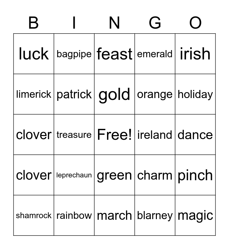 This bingo card has a free space and 24 words: leprechaun, rainbow, gold, shamrock, irish, luck, limerick, bagpipe, ireland, green, orange, clover, charm, pinch, patrick, blarney, dance, feast, holiday, treasure, magic, clover, emerald and march.