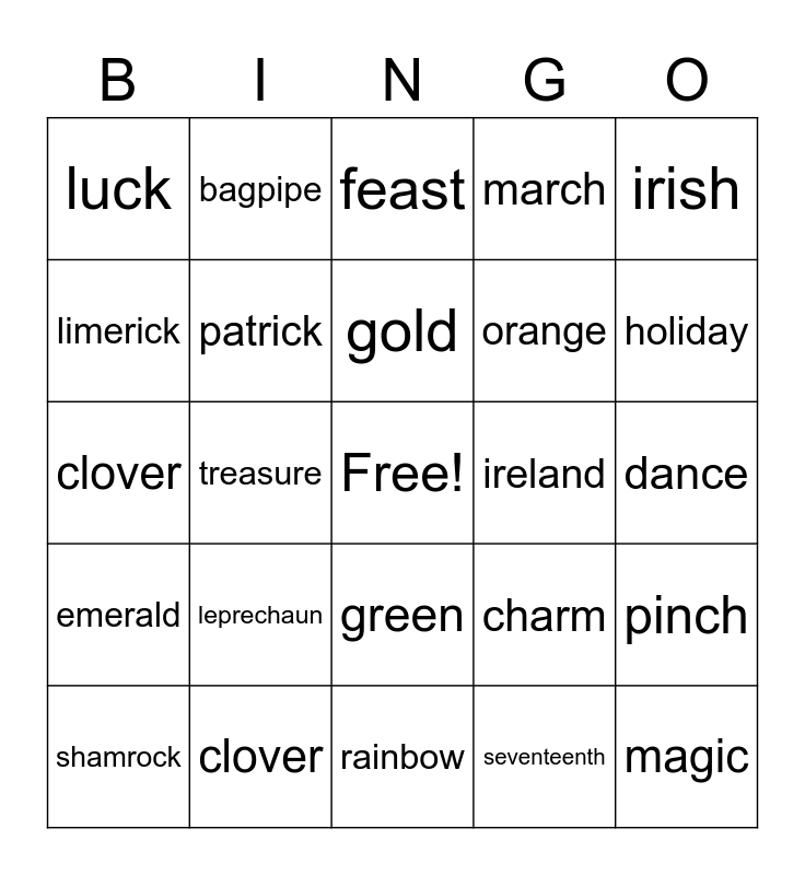 This bingo card has a free space and 25 words: leprechaun, rainbow, gold, shamrock, irish, luck, limerick, bagpipe, ireland, green, orange, clover, charm, pinch, patrick, blarney, dance, feast, holiday, treasure, magic, clover, emerald, march and seventeenth.