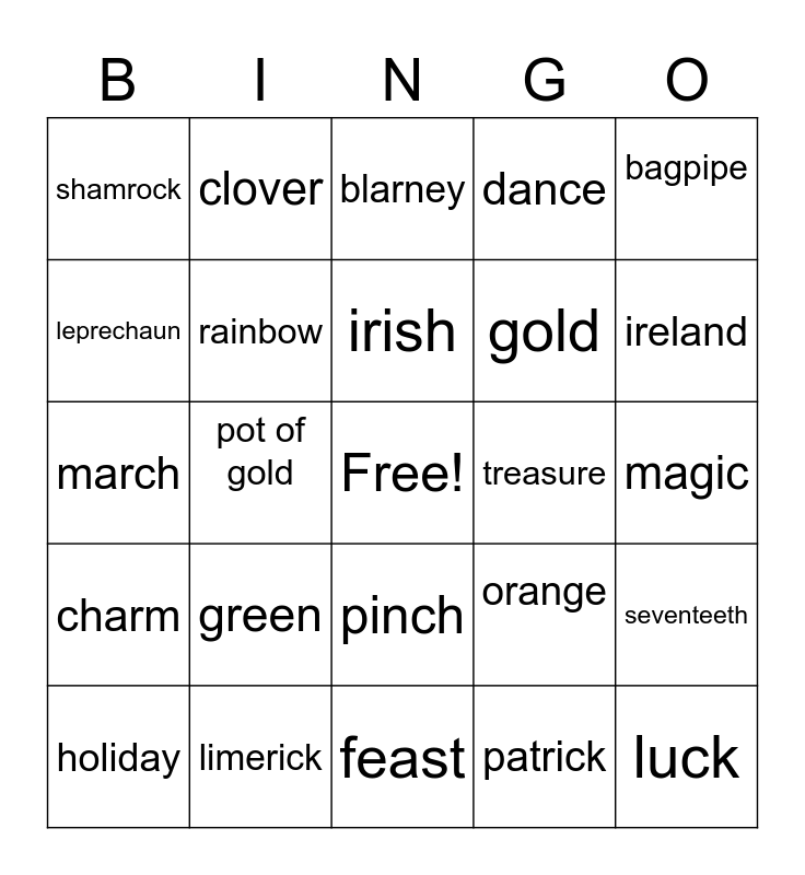 This bingo card has a free space and 24 words: green, limerick, irish, holiday, bagpipe, shamrock, leprechaun, clover, treasure, pinch, gold, march, orange, seventeeth, rainbow, patrick, magic, blarney, ireland, pot of gold, luck, charm, dance and feast.