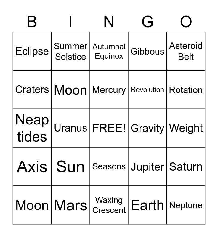 This bingo card has a free space and 24 words: Moon, Sun, Mercury, Earth, Asteroid Belt, Eclipse, Summer Solstice, Autumnal Equinox, Gravity, Weight, Neap tides, Moon, Jupiter, Saturn, Craters, Mars, Waxing Crescent, Gibbous, Rotation, Axis, Uranus, Seasons, Revolution and Neptune.