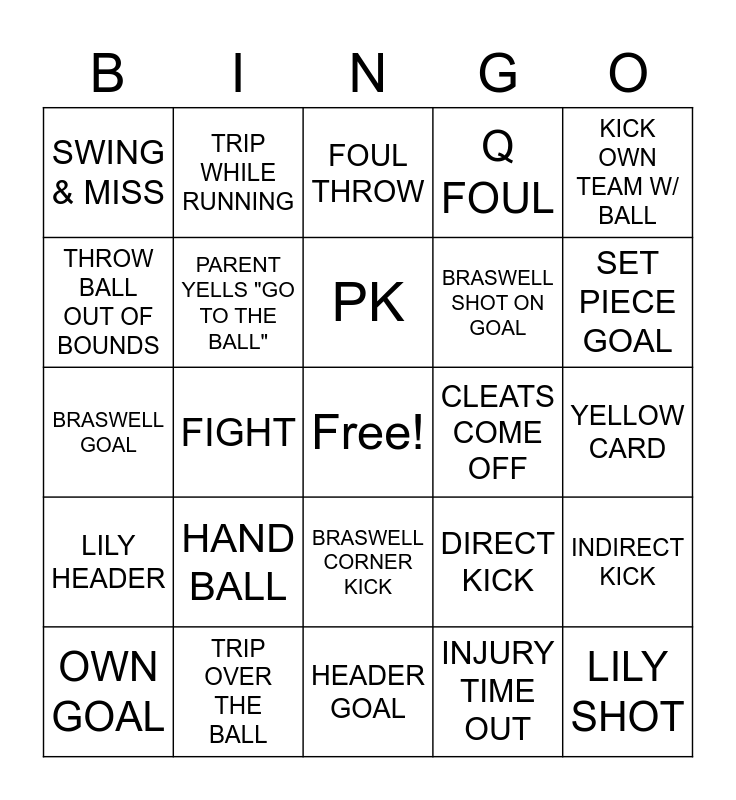 This bingo card has a free space and 24 words: HAND BALL, TRIP OVER THE BALL, PK, OWN GOAL, KICK OWN TEAM W/ BALL, SWING & MISS, THROW BALL OUT OF BOUNDS, TRIP WHILE RUNNING, CLEATS COME OFF, BRASWELL CORNER KICK, BRASWELL SHOT ON GOAL, BRASWELL GOAL, DIRECT KICK, INDIRECT KICK, PARENT YELLS "GO TO THE BALL", INJURY TIME OUT, YELLOW CARD, FOUL THROW, SET PIECE GOAL, FIGHT, LILY SHOT, LILY HEADER, Q FOUL and HEADER GOAL.