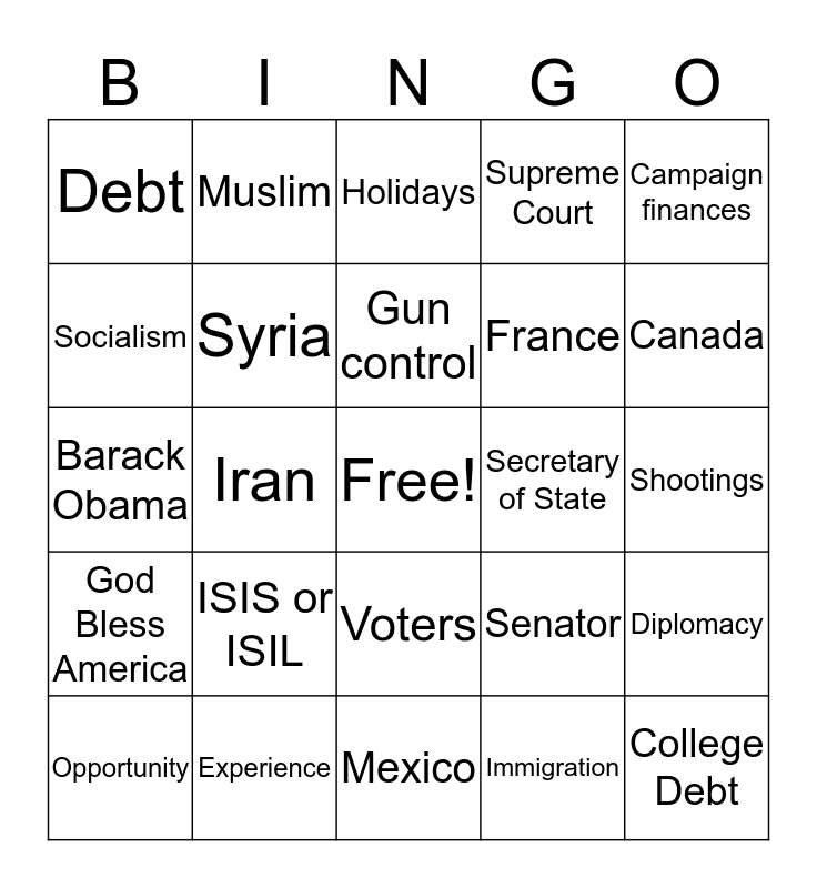 This bingo card has a free space and 24 words: ISIS or ISIL, Experience, Gun control, Opportunity, Campaign finances, Debt, Socialism, Muslim, Secretary of State, Voters, France, Barack Obama, Senator, Diplomacy, Syria, Immigration, Shootings, Holidays, Canada, Iran, College Debt, God Bless America, Supreme Court and Mexico.