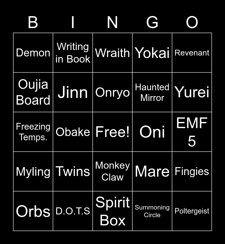 This bingo card has a free space and 36 words: Banshee, Goryo, Hantu, Jinn, Mare, Myling, Onryo, Phantom, Revenant, Raiju, Obake, Yokai, Spirit, Oni, Yurei, Demon, Shade, Twins, Poltergeist, Wraith, EMF 5, Fingies, D.O.T.S, Orbs, Spirit Box, Writing in Book, Freezing Temps., Bone, Haunted Mirror, Oujia Board, Tarot Cards, Music Box, Summoning Circle, Monkey Claw, Voodoo Doll and 3 Star Photo of Ghost.