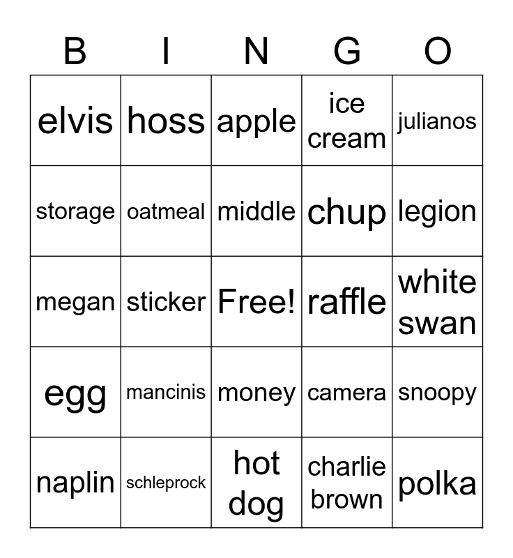 This bingo card has a free space and 30 words: schleprock, verison, sticker, lotery, elvis, apple, oatmeal, money, raffle, hot dog, white swan, polka, charlie brown, sweet pot, legion, kennywood, camera, egg, mancinis, julianos, megan, firework, hoss, chup, storage, ice cream, snoopy, naplin, middle and chorus.