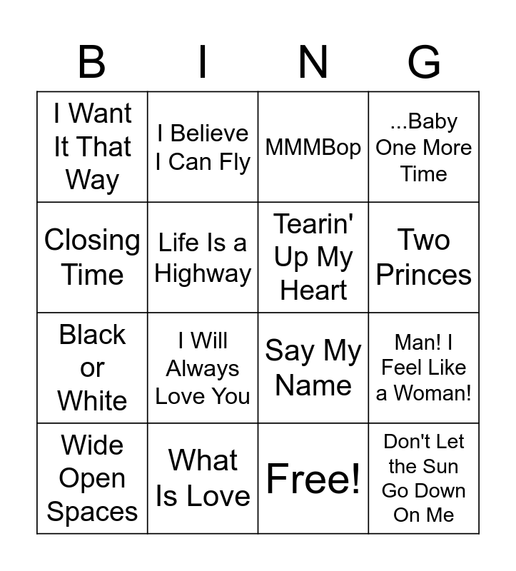 This bingo card has 26 words: Waterfalls, All Star, Two Princes, I Still Believe in You, Closing Time, I Want It That Way, Life Is a Highway, I Believe I Can Fly, Free!, Achy Breaky Heart, Black or White, Say My Name, U Can't Touch This, Un-Break My Heart, Man! I Feel Like a Woman!, Gonna Make You Sweat (Everybody Dance Now), ...Baby One More Time, Don't Let the Sun Go Down On Me, MMMBop, Wide Open Spaces, I Will Always Love You, Macarena, What Is Love, Mambo No. 5, Tearin' Up My Heart and Wonderwall.