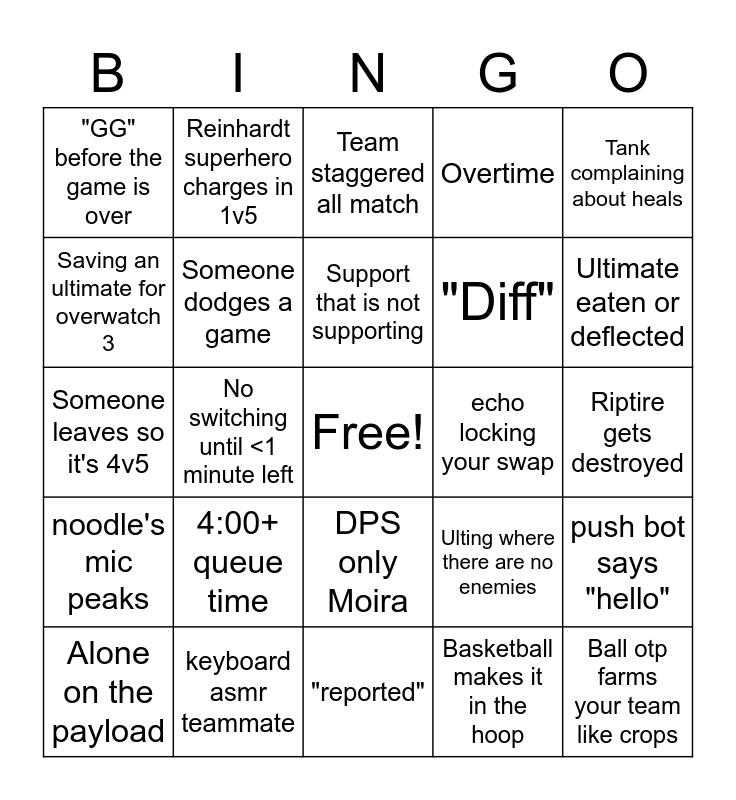 This bingo card has a free space and 77 words: Teammate on an off-role, Pocketed hitscan, Team staggered all match, Someone is throwing, Tank difference, Solo shatter, Team uses 3+ ults in 1 fight, Trash one trick on your team, Unfair matchmaking, Got your ult cancelled, Flaming in team chat, Slur in match chat, Support that is not supporting, Saving an ultimate for overwatch 3, Reddit lucio, No switching until <1 minute left, Sombra, Ball otp farms your team like crops, Dps complains about space, Tank complaining about heals, Supports complaining about tanks, Someone leaves so it's 4v5, Someone dodges a game, Reinhardt superhero charges in 1v5, Overtime, Live on single digit hp, New player in the lobby, "Huge!", C9, Nano'd the wrong person, 2-0 on control map, Someone ults all by themselves, Someone falls off the map, Ulting where there are no enemies, Ultimate eaten or deflected, "Diff", Both tank ults at once, Pharah + mercy, Riptire gets destroyed, Basketball makes it in the hoop, Someone steals your healthpack, AFK, Spray or emote during POTG, Shatter whiff, POTG with parkinson's, Team kill, Alone on the payload, "GG" before the game is over, Bastion on a payload, Duo w/ matching names, Nanoblade, DPS only Moira, Win 3 in a row, Lose 2 in a row, "This is my alt/smurf" :Nerd:, Support POTG, "ez", Need healing spammer, BM emote, Anyone tbags anyone, 4:00+ queue time, 70 iq play, 700 iq play, Mercy + genji edaters, Rein voice lines of intimidation, Flanking roadhog, negative nancy in match chat, echo locking your swap, sojourn, torb hammer kill, hurricane katrina, push bot says "hello", noodle's mic peaks, keyboard asmr teammate, tea bag, "reported" and Flex Ult.