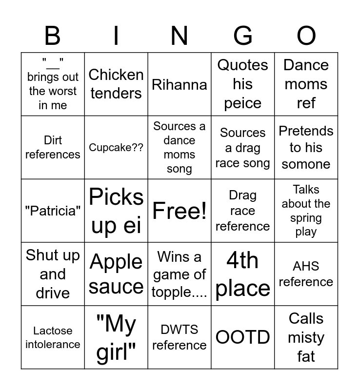 This bingo card has a free space and 24 words: Lactose intolerance, Apple sauce, Sources a dance moms song, OOTD, Dance moms ref, "__" brings out the worst in me, Chicken tenders, Rihanna, Drag race reference, Talks about the spring play, "Patricia", Cupcake??, 4th place, AHS reference, Dirt references, "My girl", DWTS reference, Quotes his peice, Pretends to his somone, Shut up and drive, Picks up ei, Wins a game of topple...., Sources a drag race song and Calls misty fat.