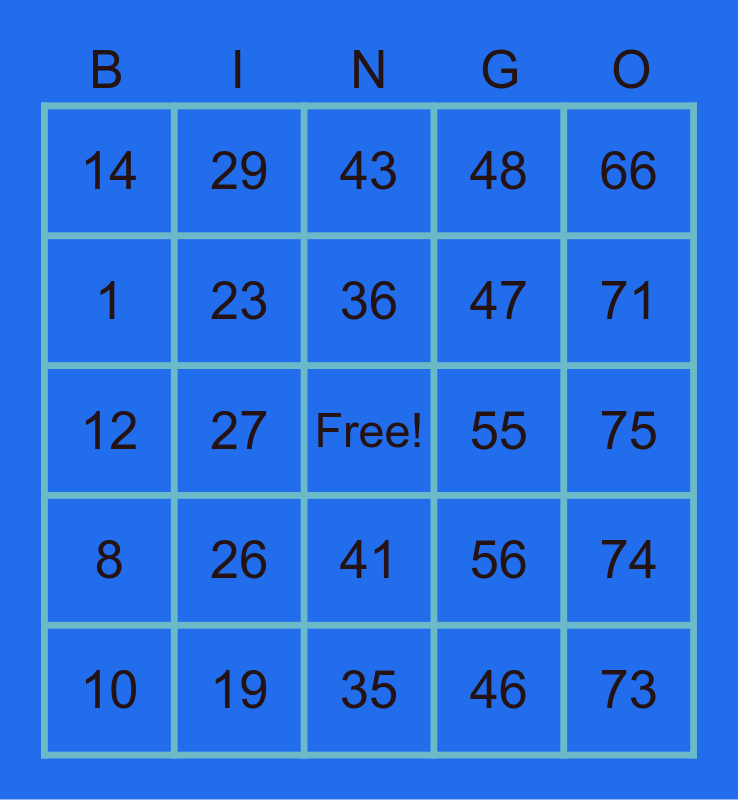 This bingo card has a free space and 24 words: 10, 26, 36, 46, 66, 14, 29, 43, 55, 75, 12, 23, 56, 74, 1, 19, 35, 48, 71, 8, 27, 41, 47 and 73.