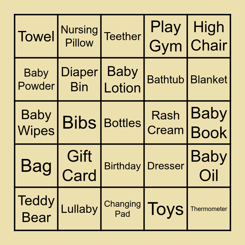 This bingo card has 51 words: Free!, Bottles, Baby Food Powder, Changing Pad, Gift Card, Baby Hat, Nursing Pillow, Bottle Warmer, Baby Powder, Wash Cloth, Diaper Bin, Play Gym, Baby Oil, Dresser, Jumpsuit, Diaper Bag, Baby Lotion, Rash Cream, Nail Clippers, High Chair, Bibs, Toys, Towel, Bathtub, Rattle, Thermometer, Blanket, Soft Toys, Teddy Bear, Teether, Socks, Booties, Sweater, Baby Shampoo, Story Books, Lullaby, Candy, Kajal, Bow, Silver Spoon, Baby Book, Bag, Pram, Cradle, Baby Girl, Baby Boy, Baby Wipes, Baby Carrier, Walker, Birthday and Milk Bottle.