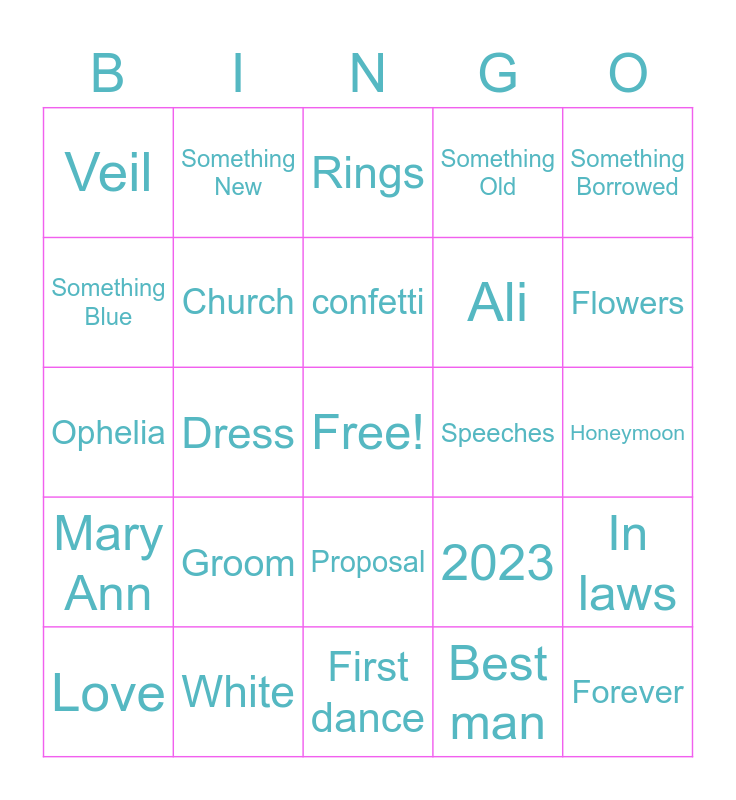 This bingo card has a free space and 29 words: Love, Vows, Dress, Bride, Veil, Rings, Church, Groom, Speeches, White, Honeymoon, Forever, First dance, Best man, Flowers, Photos, Proposal, Mary Ann, Something Borrowed, Ophelia, 2023, I do, Ali, Something Blue, Something Old, Something New, In laws, confetti and Wedded Bliss.