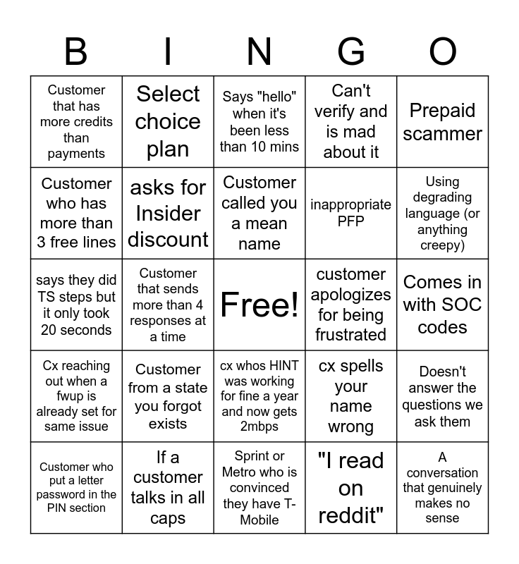 This bingo card has a free space and 24 words: Customer from a state you forgot exists, If a customer talks in all caps, Customer called you a mean name, Customer who put a letter password in the PIN section, Prepaid scammer, Customer that has more credits than payments, Customer who has more than 3 free lines, Select choice plan, customer apologizes for being frustrated, cx whos HINT was working for fine a year and now gets 2mbps, inappropriate PFP, says they did TS steps but it only took 20 seconds, cx spells your name wrong, Doesn't answer the questions we ask them, asks for Insider discount, "I read on reddit", Comes in with SOC codes, Says "hello" when it's been less than 10 mins, Using degrading language (or anything creepy), Customer that sends more than 4 responses at a time, A conversation that genuinely makes no sense, Cx reaching out when a fwup is already set for same issue, Can't verify and is mad about it and Sprint or Metro who is convinced they have T-Mobile.