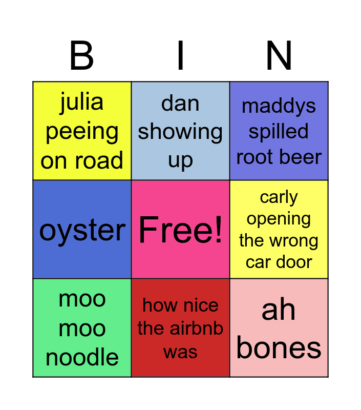This bingo card has a free space and 8 words: carly opening the wrong car door, maddys spilled root beer, dan showing up, moo moo noodle, julia peeing on road, ah bones, oyster and how nice the airbnb was.