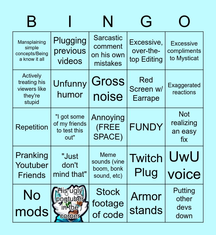 This bingo card has 1 images, a free space and 29 words: No mods, UT OST #55, "I got some of my friends to test this out", Screaming, Mansplaining simple concepts/Being a know it all, Sarcastic comment on his own mistakes, Unfunny humor, "Just don't mind that", FUNDY, His ugly pngtuber in the corner, Not realizing an easy fix, Putting other devs down, Stock footage of code, Armor stands, Exaggerated reactions, "I made ___ in vanilla Minecraft", Meme sounds (vine boom, bonk sound, etc), Pranking Youtuber Friends, Excessive compliments to Mysticat, Repetition, Twitch Plug, Command Block Flexing, Red Screen w/ Earrape, Actively treating his viewers like they're stupid, Excessive, over-the-top Editing, Plugging previous videos, UwU voice, Gross noise and Old man voice.