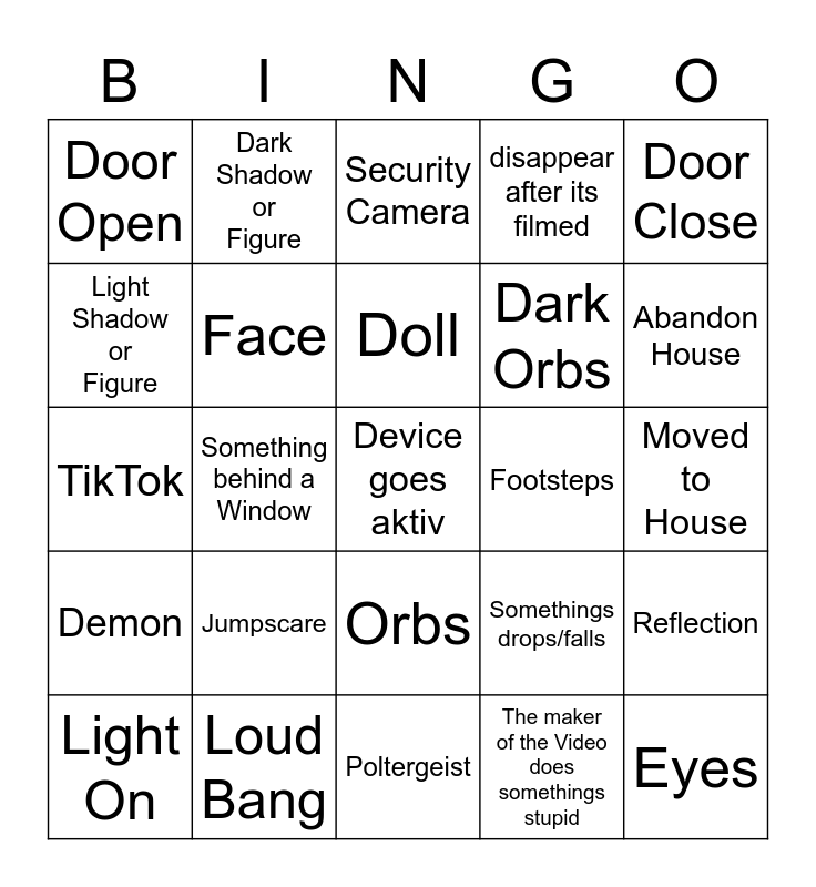 This bingo card has 25 words: Jumpscare, Poltergeist, Doll, Light On, Door Close, Door Open, Light Shadow or Figure, Dark Shadow or Figure, Footsteps, Orbs, Dark Orbs, TikTok, Somethings drops/falls, Reflection, Face, Eyes, Moved to House, Security Camera, Abandon House, Something behind a Window, Device goes aktiv, Loud Bang, Demon, disappear after its filmed and The maker of the Video does somethings stupid.