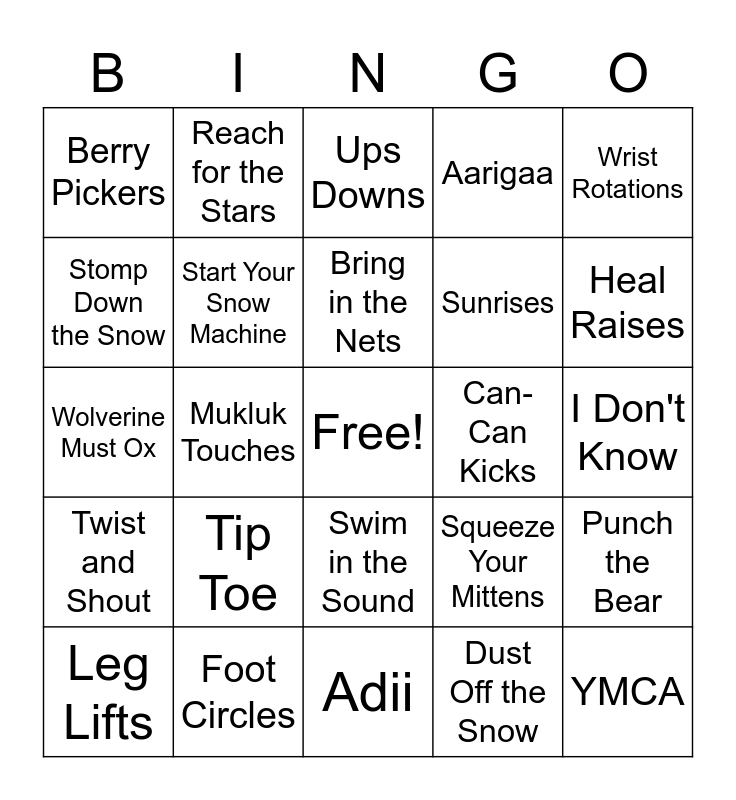 This bingo card has a free space and 24 words: Tip Toe, Foot Circles, Bring in the Nets, Leg Lifts, Wrist Rotations, Berry Pickers, Stomp Down the Snow, Reach for the Stars, Can-Can Kicks, Swim in the Sound, Sunrises, Wolverine Must Ox, Squeeze Your Mittens, Punch the Bear, Start Your Snow Machine, Dust Off the Snow, I Don't Know, Ups Downs, Heal Raises, Mukluk Touches, YMCA, Twist and Shout, Aarigaa and Adii.