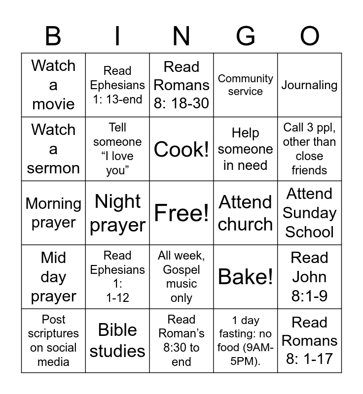 This bingo card has a free space and 24 words: Read Ephesians 1: 1-12, Bible studies, Cook!, Post scriptures on social media, Journaling, Watch a movie, Watch a sermon, Read Ephesians 1: 13-end, Attend church, All week, Gospel music only, Help someone in need, Morning prayer, Bake!, Read John 8:1-9, Tell someone “I love you”, 1 day fasting: no food (9AM-5PM)., Attend Sunday School, Read Romans 8: 18-30, Call 3 ppl, other than close friends, Night prayer, Read Romans 8: 1-17, Mid day prayer, Community service and Read Roman’s 8:30 to end.