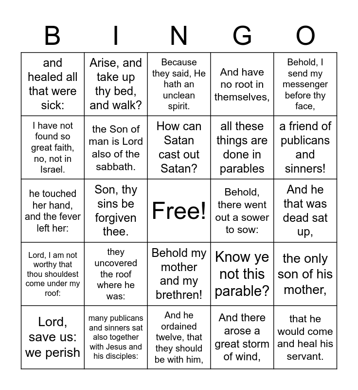 This bingo card has a free space and 41 words: Lord, if thou wilt, thou canst make me clean., they uncovered the roof where he was:, whether he would heal him on the sabbath day;, Behold, there went out a sower to sow:, that he would come and heal his servant., Lord, I am not worthy that thou shouldest come under my roof:, Son, thy sins be forgiven thee., how they might destroy him., all these things are done in parables, the only son of his mother,, I have not found so great faith, no, not in Israel., Arise, and take up thy bed, and walk?, Know ye not this parable?, And he that was dead sat up,, he touched her hand, and the fever left her:, many publicans and sinners sat also together with Jesus and his disciples:, And unclean spirits, when they saw him, fell down before him,, And have no root in themselves,, Art thou he that should come?, and healed all that were sick:, Why do the disciples of John and of the Pharisees fast, but thy disciples fast not?, And he ordained twelve, that they should be with him,, And these are they which are sown among thorns;, Behold, I send my messenger before thy face,, Master, I will follow thee whithersoever thou goest., that he went through the corn fields on the sabbath day;, How can Satan cast out Satan?, If any man have ears to hear, let him hear., a friend of publicans and sinners!, What have we to do with thee, Jesus, thou Son of God?, The sabbath was made for man,, Because they said, He hath an unclean spirit., And there arose a great storm of wind,, behold, a woman in the city, which was a sinner,, Lord, save us: we perish, the Son of man is Lord also of the sabbath., Behold my mother and my brethren!, Why are ye so fearful?, Her sins, which are many, are forgiven;, that even the wind and the sea obey him? and Thy faith hath saved thee; go in peace..