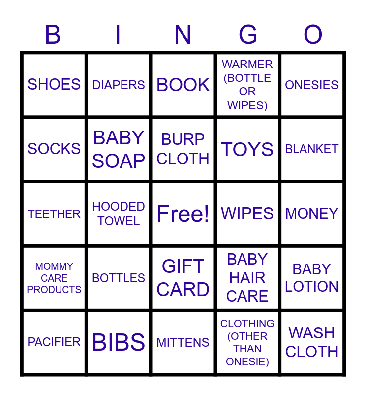 This bingo card has a free space and 24 words: BOTTLES, BIBS, BURP CLOTH, PACIFIER, ONESIES, SHOES, SOCKS, DIAPERS, WIPES, GIFT CARD, TOYS, TEETHER, BABY HAIR CARE, BABY LOTION, BABY SOAP, CLOTHING (OTHER THAN ONESIE), MONEY, BOOK, BLANKET, HOODED TOWEL, WASH CLOTH, MOMMY CARE PRODUCTS, WARMER (BOTTLE OR WIPES) and MITTENS.