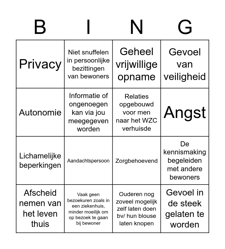 This bingo card has 19 words: Zorgbehoevend, Gedeeltelijk vrijwillige opname, Geheel vrijwillige opname, Gevoel in de steek gelaten te worden, De kennismaking begeleiden met andere bewoners, Autonomie, Ouderen nog zoveel mogelijk zelf laten doen bv/ hun blouse laten knopen, Privacy, Niet snuffelen in persoonlijke bezittingen van bewoners, Lichamelijke beperkingen, Aandachtspersoon, Informatie of ongenoegen kan via jou meegegeven worden, Relaties opgebouwd voor men naar het WZC verhuisde, Vaak geen bezoekuren zoals in een ziekenhuis, minder moeilijk om op bezoek te gaan bij bewoner, Afscheid nemen van het leven thuis, Ze voelen zich soms waardeloos, Gevoel van veiligheid, Angst and Zorgen voor warme en menselijke relaties.