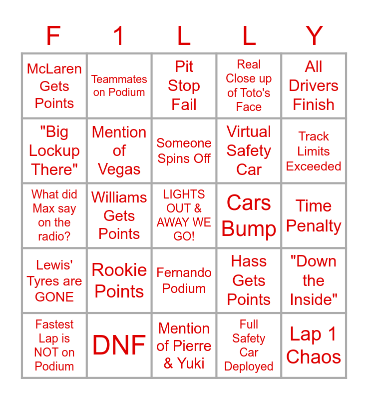 This bingo card has a free space and 24 words: Rookie Points, DNF, Someone Spins Off, Fastest Lap is NOT on Podium, All Drivers Finish, McLaren Gets Points, "Big Lockup There", Teammates on Podium, Cars Bump, Fernando Podium, Virtual Safety Car, What did Max say on the radio?, Hass Gets Points, "Down the Inside", Mention of Vegas, Full Safety Car Deployed, Time Penalty, Pit Stop Fail, Track Limits Exceeded, Williams Gets Points, Lap 1 Chaos, Lewis' Tyres are GONE, Real Close up of Toto's Face and Mention of Pierre & Yuki.