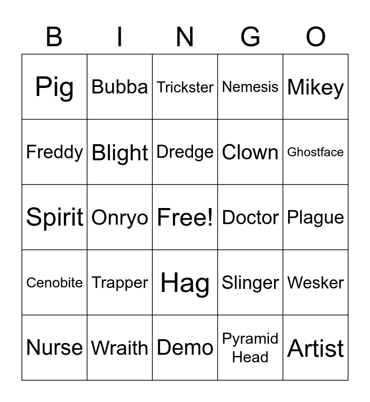 This bingo card has a free space and 24 words: Trapper, Wraith, Dredge, Nurse, Mikey, Pig, Freddy, Bubba, Doctor, Hag, Clown, Spirit, Slinger, Wesker, Blight, Pyramid Head, Plague, Trickster, Ghostface, Onryo, Artist, Cenobite, Nemesis and Demo.