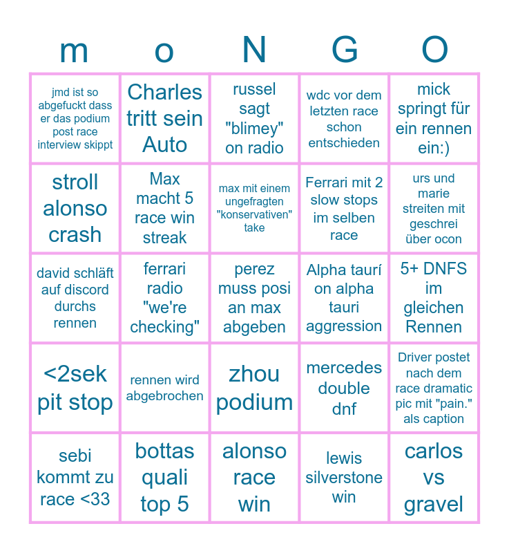 This bingo card has 25 words: <2sek pit stop, bottas quali top 5, perez muss posi an max abgeben, lewis silverstone win, mick springt für ein rennen ein:), jmd ist so abgefuckt dass er das podium post race interview skippt, Charles tritt sein Auto, russel sagt "blimey" on radio, Alpha taurí on alpha tauri aggression, Driver postet nach dem race dramatic pic mit "pain." als caption, stroll alonso crash, Max macht 5 race win streak, alonso race win, mercedes double dnf, urs und marie streiten mit geschrei über ocon, sebi kommt zu race <33, ferrari radio "we're checking", max mit einem ungefragten "konservativen" take, Ferrari mit 2 slow stops im selben race, 5+ DNFS im gleichen Rennen, david schläft auf discord durchs rennen, rennen wird abgebrochen, zhou podium, wdc vor dem letzten race schon entschieden and carlos vs gravel.