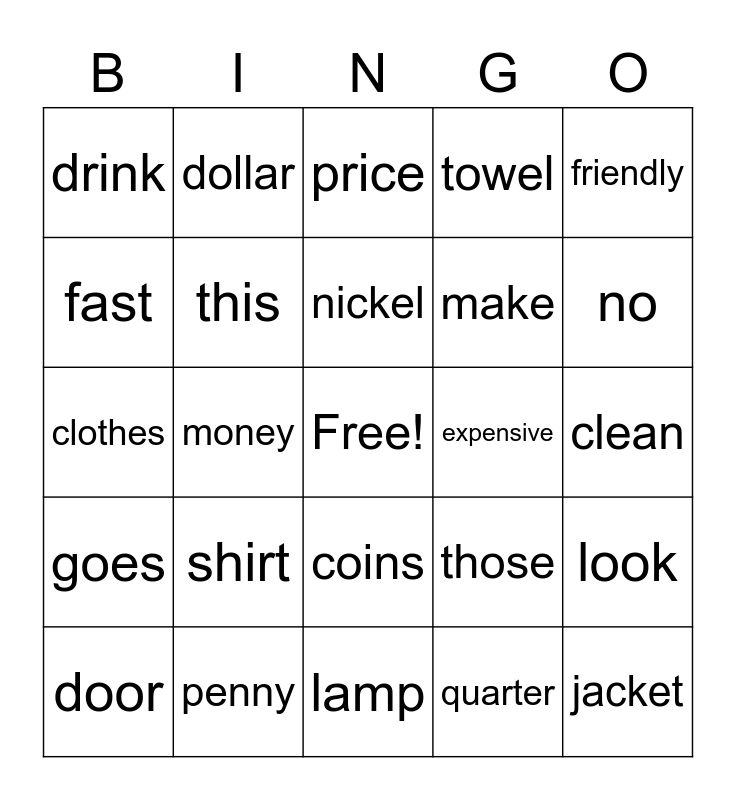 This bingo card has a free space and 39 words: bills, cheap, sweater, this, door, coins, nickel, high, friendly, goes, money, towel, jacket, clean, expensive, shirt, clerk, drink, brush, those, fast, lamp, make, no, pants, comb, dime, everything, cents, dollar, low, give, price, penny, quarter, razor, look, clothes and shoes.