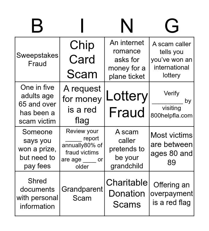 This bingo card has 21 words: Grandparent Scam, Romance Scam, Chip Card Scam, Getting calls from yourself, Charitable Donation Scams, Lottery Fraud, Sweepstakes Fraud, An internet romance asks for money for a plane ticket, A scam caller pretends to be your grandchild, Verify _________ by visiting 800helpfla.com, Someone says you won a prize, but need to pay fees, A scam caller tells you you’ve won an international lottery, Offering an overpayment is a red flag, Broken English/poor grammar is a red flag, A request for money is a red flag, Use _______ that are difficult to guess but easy to remember, Shred documents with personal information, Review your _____ report annually80% of fraud victims are age ____ or older, One in five adults age 65 and over has been a scam victim, Most victims are between ages 80 and 89 and Women are _____ times as likely to be targeted.