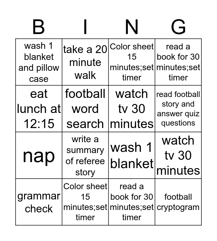 This bingo card has a free space and 15 words: grammar check, football cryptogram, Color sheet 15 minutes;set timer, wash 1 blanket and pillow case, read football story and answer quiz questions, eat lunch at 12:15, write a summary of referee story, read a book for 30 minutes;set timer, football word search, nap, watch tv 30 minutes, read a book for 30 minutes;set timer, watch tv 30 minutes, take a 20 minute walk and Color sheet 15 minutes;set timer.